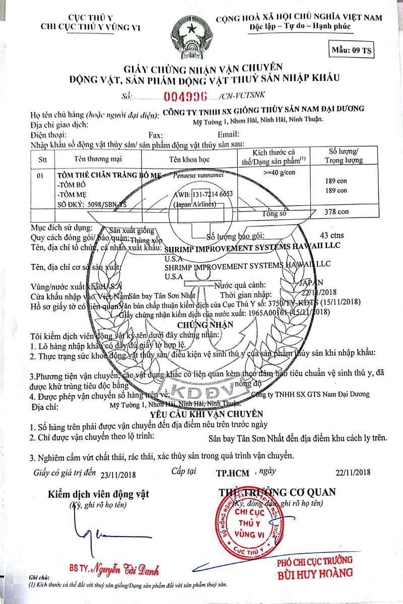 Công Ty Sản Xuất Tôm Giống Nam Đại Dương đạt chứng nhận cơ sở an toàn dịch bệnh động vật thủy sản