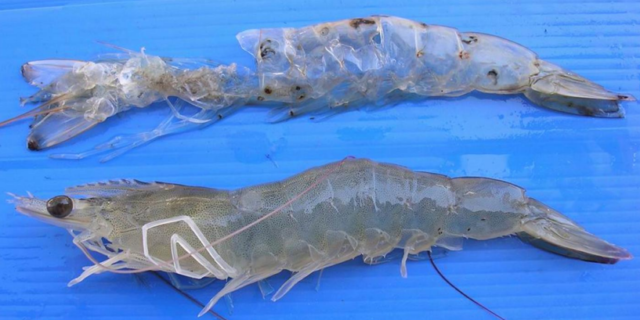 Hình 28: Tôm thẻ chân trắng bệnh đốm đen, sau khi lột vỏ tôm có thể hồi phục.