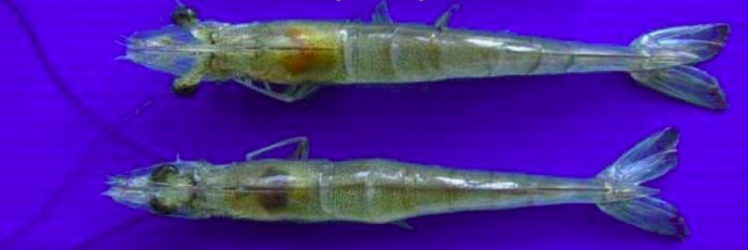Hình 13:Tôm thẻ chân trắng nhiễm bệnh đầu vàng YHV/GAV (bên trên) so với tôm khỏe (bên dưới).