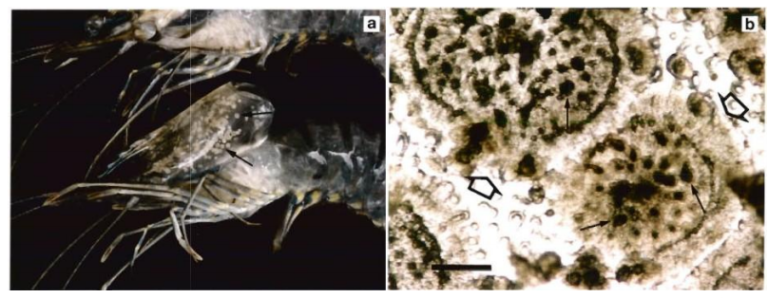 Hình 5: Tôm bệnh đốm trắng do virus WSSV (Wang et al., 2000). Soi mẫu tươi dưới kính hiển vi đốm trắng cho thấy có viền tròn bao quanh (mũi tên to, rỗng), chính giữa có nhiều đốm đen