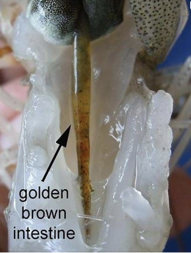 - Thức ăn trong đường ruột không cố định chuyển động khi lắc nhẹ thân tôm.