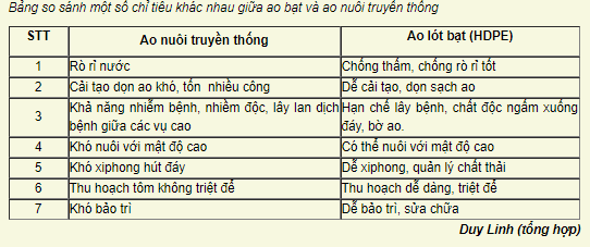 Bảng so sánh một số chỉ tiêu khác nhau giữa ao bạt và ao nuôi truyền thống
