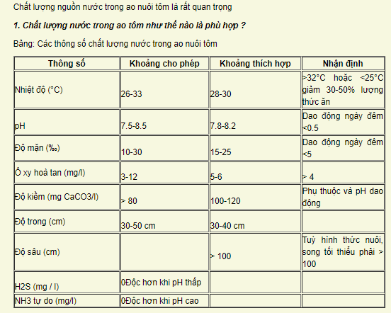 Nhiệt độ là một trong những yếu tố quan trọng nhất trong nuôi trồng thuỷ sản. Nhiệt độ phù hợp cho tôm và tảo thực vật có lợi là 28°C-33°C. Nhiệt độ không nên thay đổi đột ngột, nếu biến động quá 5°C/ngày sẽ làm cho tôm giảm ăn. Nếu nhiệt độ >33°C hoặc <25°C tôm giảm ăn từ 30-50%. Nhiệt độ thấp tôm giảm ăn hoặc ngưng ăn, chậm hoặc không lớn. Nhiệt độ cao > 35°C, nhóm tảo lam gây hại cho tôm sẽ phát triểnQuản lý nhiệt độ như thế nào ?Thiết kế ao nuôi đủ độ sâu > 1m. Thả nuôi đúng mùa vụ. Mùa vụ ở Nghệ An, Thanh Hoá qui định là tháng cuối tháng 3 đầu tháng 4 dương lịch (sau tết Thanh Minh 3/3 âm lịch) và ở Thừa Thiên Huế là tháng 2- 3 và tháng 6-7 dương lịch. Có ao chứa để xử lý khi nhiệt độ dao động quá 5°C trong ngày.