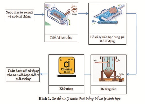 Nước thay và nước xi phông sẽ được tách các chất rắn lơ lửng bằng thiết bị lọc trống. Nước sau khi tách chất rắn lơ lửng sẽ được đưa vào các bể xử lý sinh học. Tại đây, bể lọc sinh học với các giá thể sinh học lơ lửng trong nước sẽ được sục khí tích cực và nhờ vào số lượng lớn vi sinh trong bùn hoạt tính sẽ chuyển hỏa các hợp chất hữu cơ hòa tan thành hợp chất vô cơ không độc hoặc sinh khối vi khuẩn. Nước sau khi qua khỏi bể lọc sinh học được chuyển qua bể lắng để tách bùn, sau đó chuyển qua bể khử trùng diệt khuẩn và tuần hoàn tái sử dụng hoặc thải ra môi trường. Lượng bùn phát sinh từ bể lắng sẽ được thu gom vào bể chứa bùn để xử lý hoặc tận dụng trồng cây.