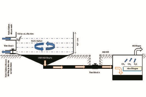 Bùn sau khỉ lắng sẽ được đưa vào hệ thống biogas, tại đây bùn được phân hủy yếm khí để tạo khí gas sinh học phục vụ sinh hoạt hàng ngày. Lượng nước thải phát sinh từ biogas sẽ được đưa vào ao xử lý sinh học 1 để xử lý. Thể tích biogas sẽ được tính toán phù hợp với lượng nước xi phông hàng ngày của hệ thống ao nuôi, với thời gian lưu bùn tối thiểu trong hầm biogas là 30 ngày.