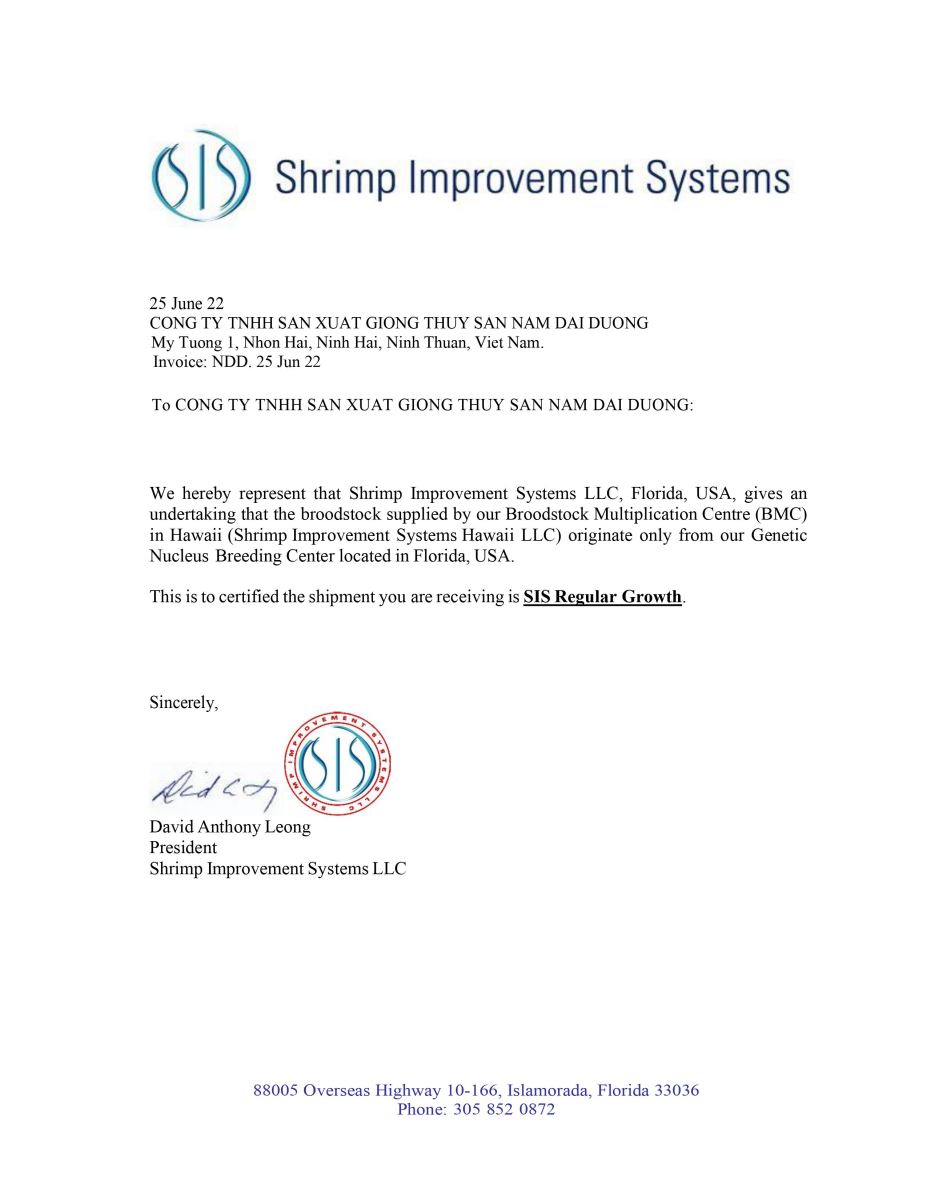 GIẤY CHỨNG NHẬN TỪ CÔNG TY Shrimp Improvement Systems Gửi Đến Công Ty Nam Đại Dương
