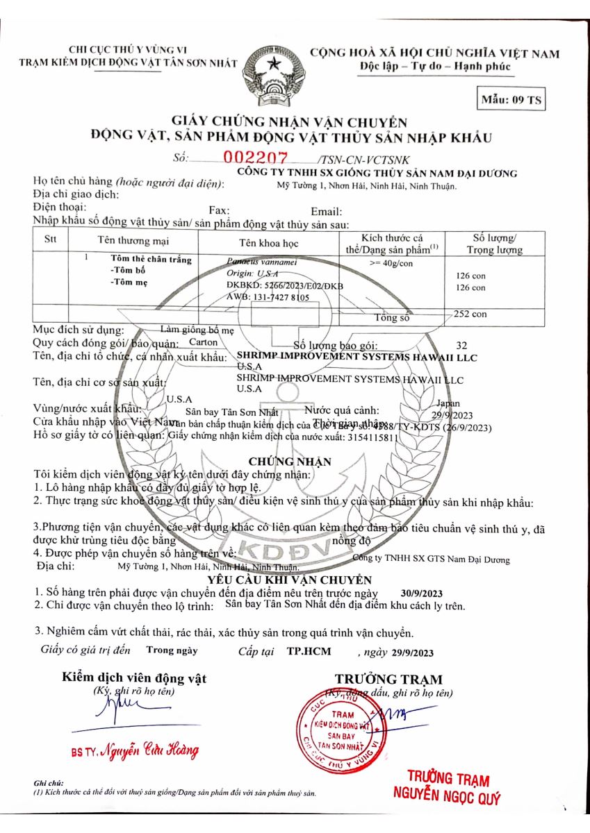Công Ty Sản Xuất GTS Nam Đại Dương nhập thêm tôm bố mẹ mới đưa vào ương dưỡng phục vụ tôm trong thời gian tới cho bà con nuôi cả nước . Công Ty chọn Tôm Bố Mẹ Từ Công Ty Sis hawaii (Mỹ )