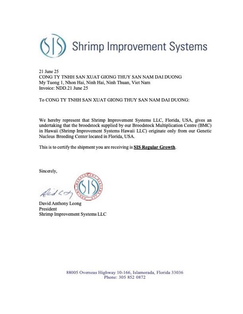 Tất cả lô tôm bố mẹ SIS Regular Growth được kiểm dịch đầy đủ trước khi đưa vào sản xuất. Kết quả xét nghiệm mới nhất (ngày 25/6/2025) cho thấy tôm giống từ khu nuôi Nam Đại Dương âm tính với các mầm bệnh nguy hiểm như AHPND, EHP, IHHNV, WSSV, TPD, NHP.