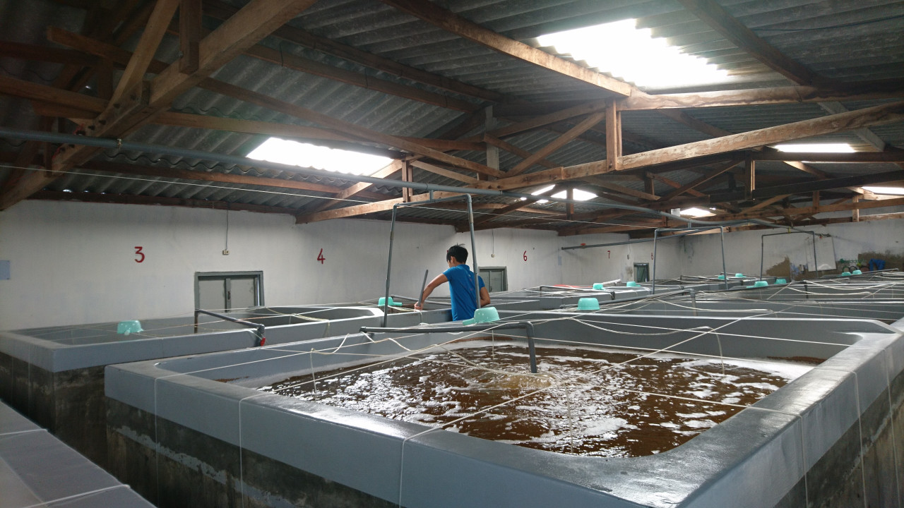 Hệ thống bể ương nuôi ấu trùng được chia thành nhiều trại ương giống, mỗi trại là một phân xưởng sản xuất gồm 20-40 bể ương có kích thước 2 x 2 x 1,2m hay 2,2 x 2,2 x 1,2m ( độ sâu có thể đến 1,5m). ( Ảnh Nam Đại Dương)